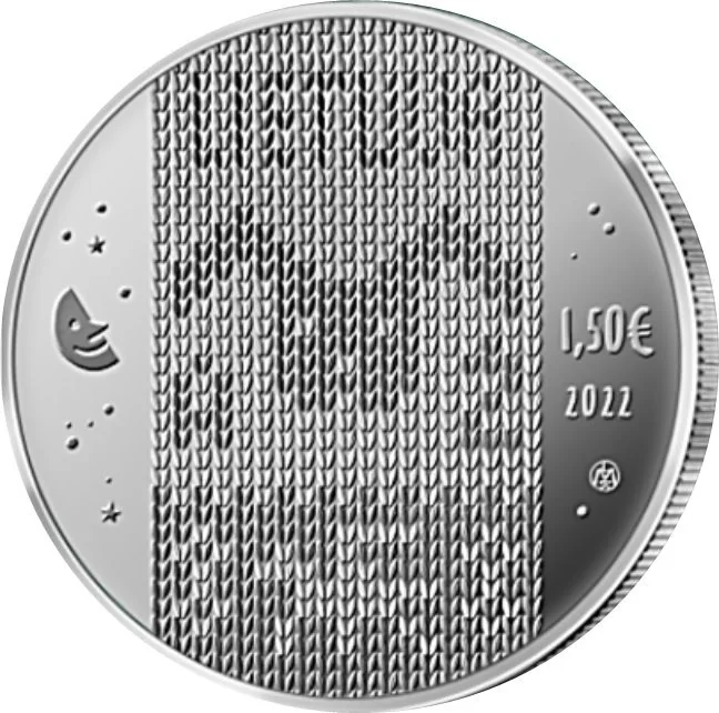 The obverse depicts the tale's main knitting motif, the inscription "Lietuva," and a silhouette of the Vytis, surrounded by stars and a moon evoking a cozy storytelling evening. The right side features the denomination €1.50 and the issue year 2022.