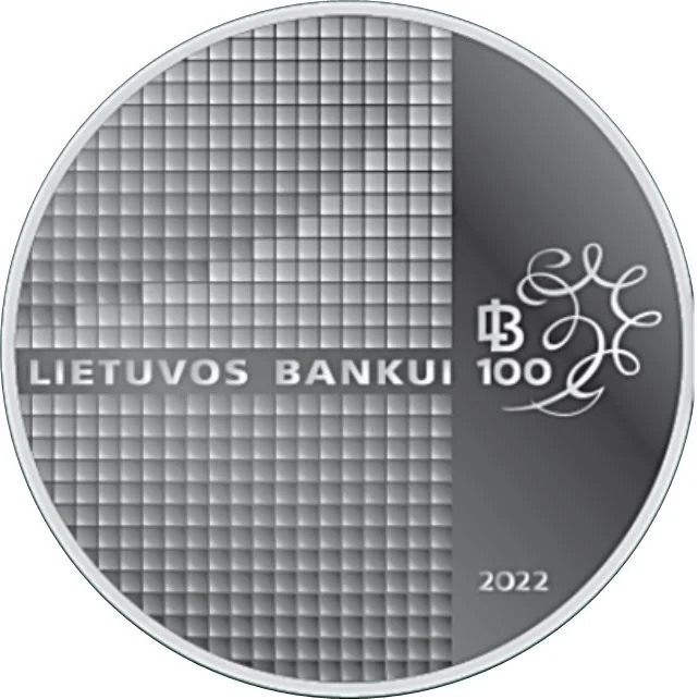 The coin's reverse symbolically envisions the future, featuring the inscription “Lietuvos bankui 100,” a segment of the Bank of Lithuania logo, and the year 2022.