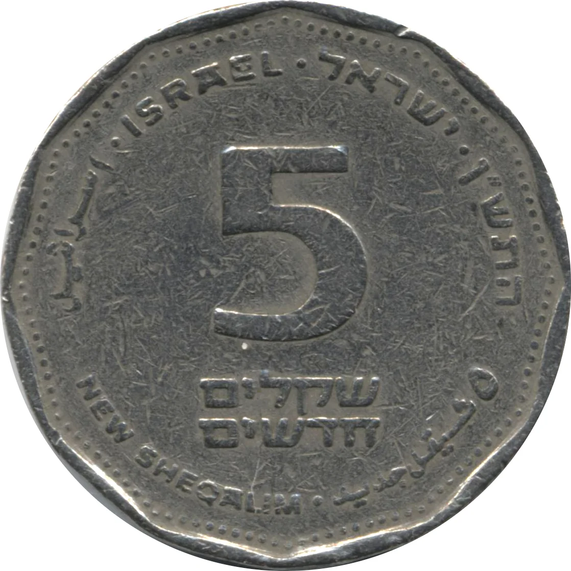 "5 New Sheqalim" and "Israel" in Hebrew, Arabic, and English; Hebrew date; "pearls" border.