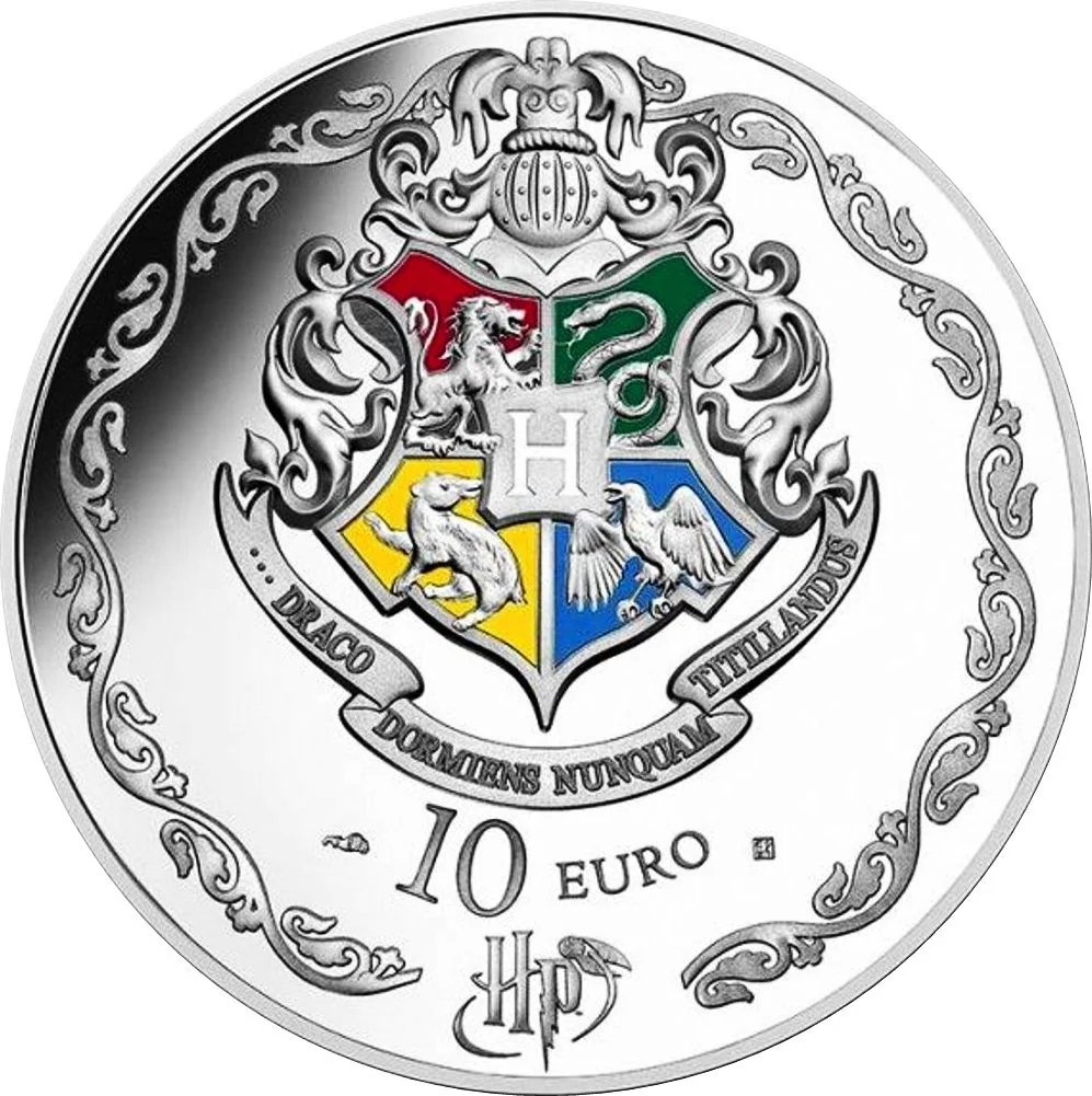 Hogwarts coat of arms with mascots on a colored field.