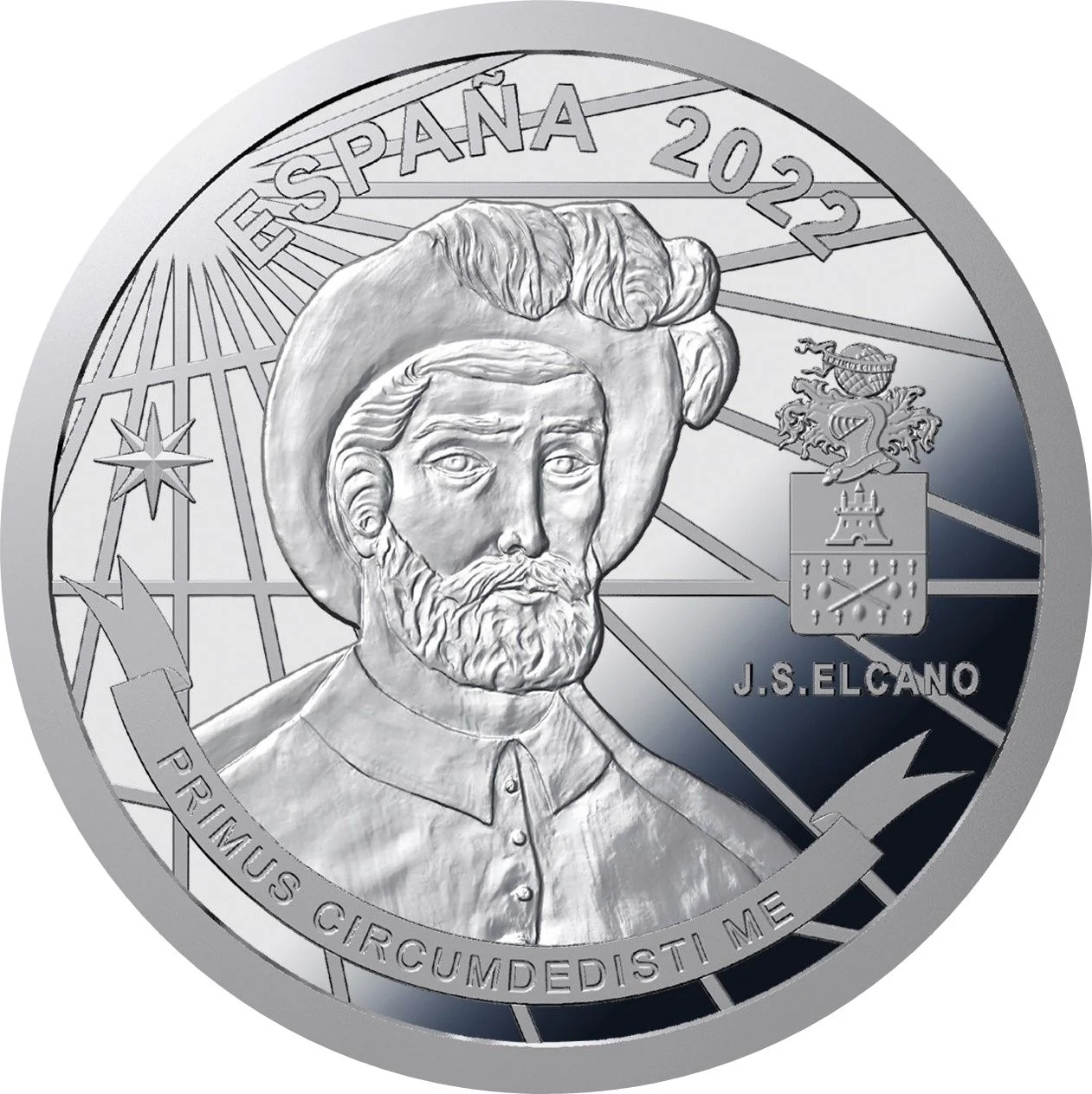 Image of Juan Sebastián de Elcano from his Naval Museum portrait, topped by a compass rose. At right is his coat of arms. Below, the legend "Primus Circundedisti me" appears over a background of wind grid lines.