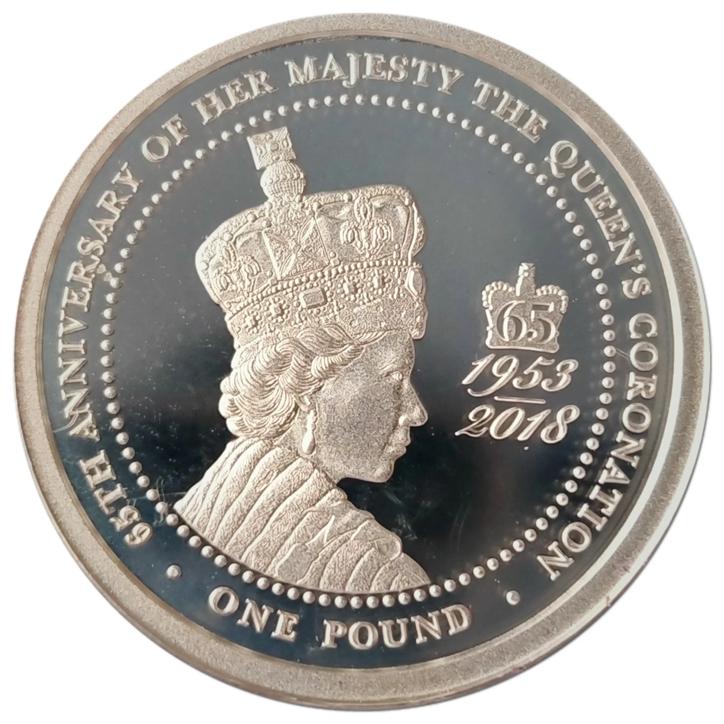 Queen Elizabeth II bust in coronation crown, with crown and dates beside, surrounded by inscriptions.