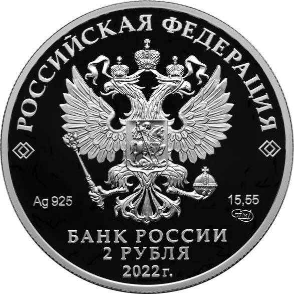 The obverse features the Russian coat of arms, inscriptions for "Russian Federation" and "Bank of Russia," the denomination "2 Roubles," the issue year "2022," the metal's chemical symbol, fineness, mint mark, and fine metal content.