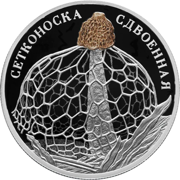 The reverse features a color-printed wood witch fungus in relief, with a laser-treated matte net, set against relief grass. The inscription "СЕТКОНОСКА СДВОЕННАЯ" (PHALLUS DUPLICATUS) appears around the upper circumference.