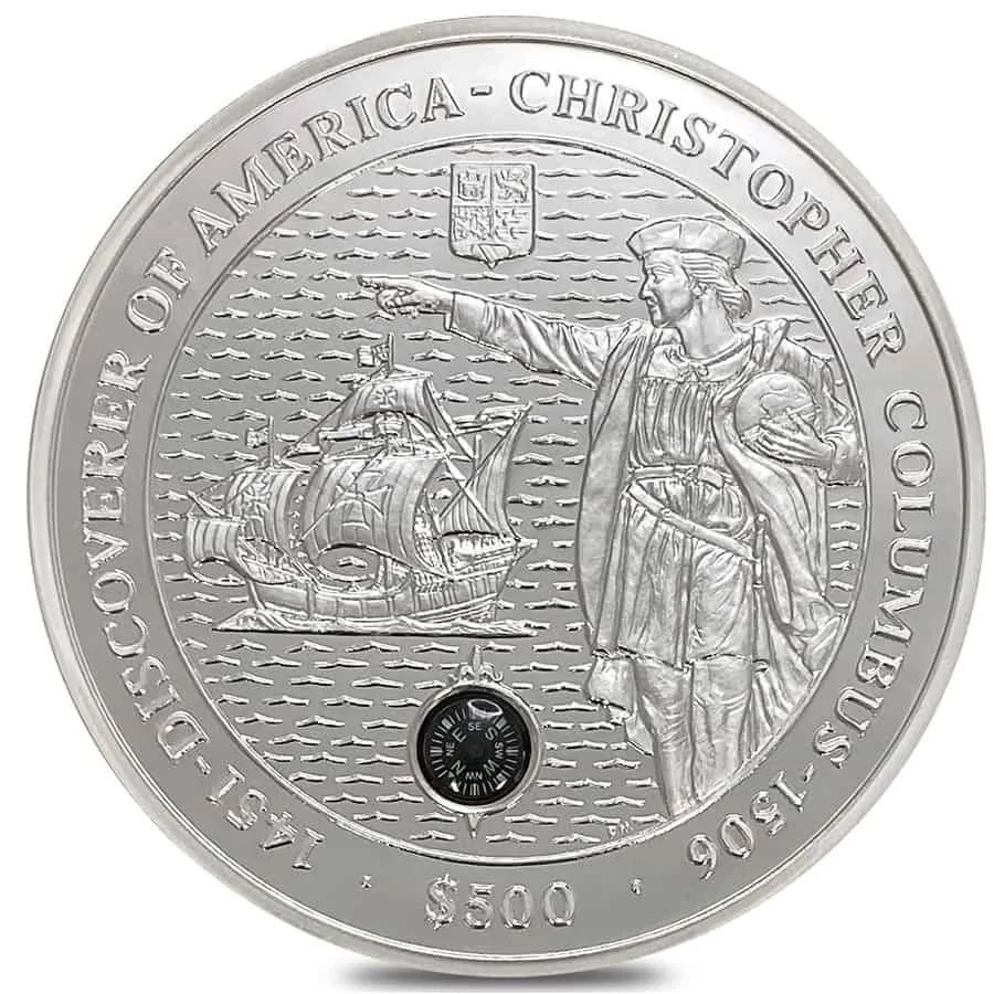 Columbus on right, gesturing; ship left, compass below.