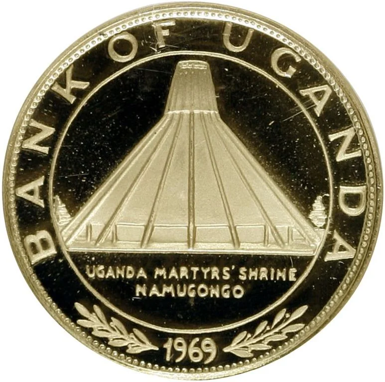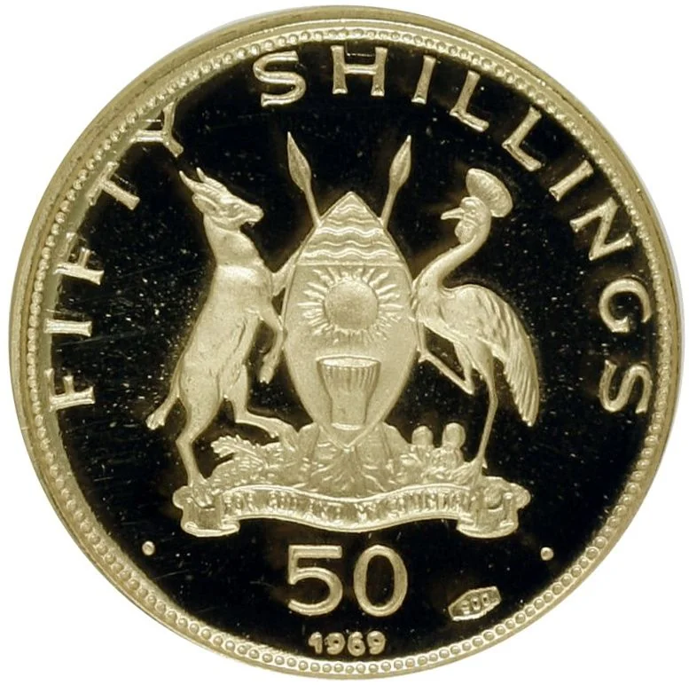 Ugandan coat of arms detail. Dotted rim circle. Issue date below.