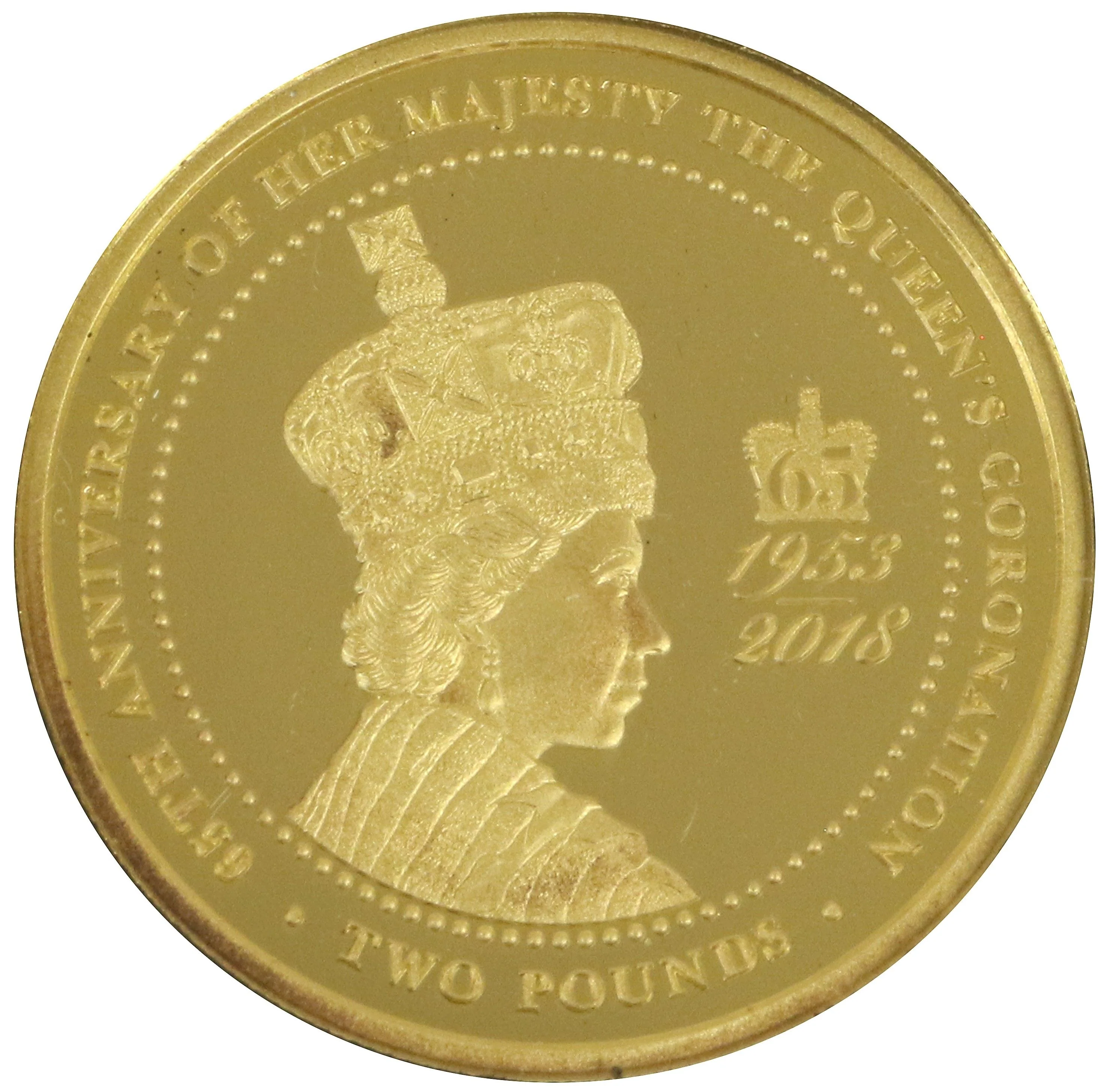 Queen Elizabeth II bust in coronation crown, with crown and dates beside, surrounded by inscriptions.