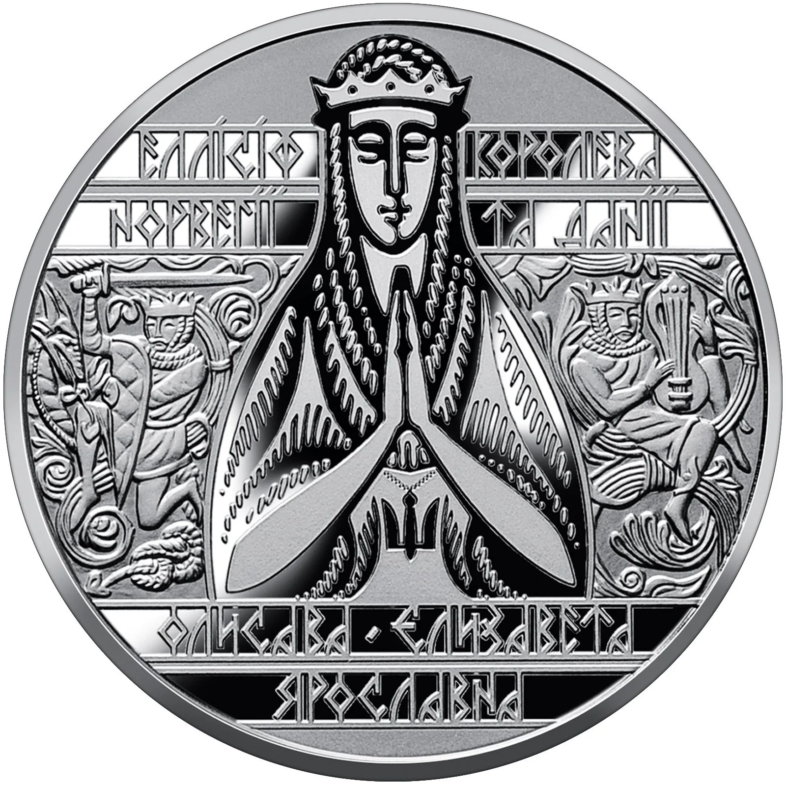 A stylized portrait of Elizabeth Yaroslavna before a decorative frieze in Scandinavian carving style, depicting her husband Harald's military and poetic deeds. Runic inscriptions read: "ELLISIF QUEEN / NORWAY AND DENMARK" beside her, and "OLISOVA ELIZABETH / YAROSLAVNAYA" below.