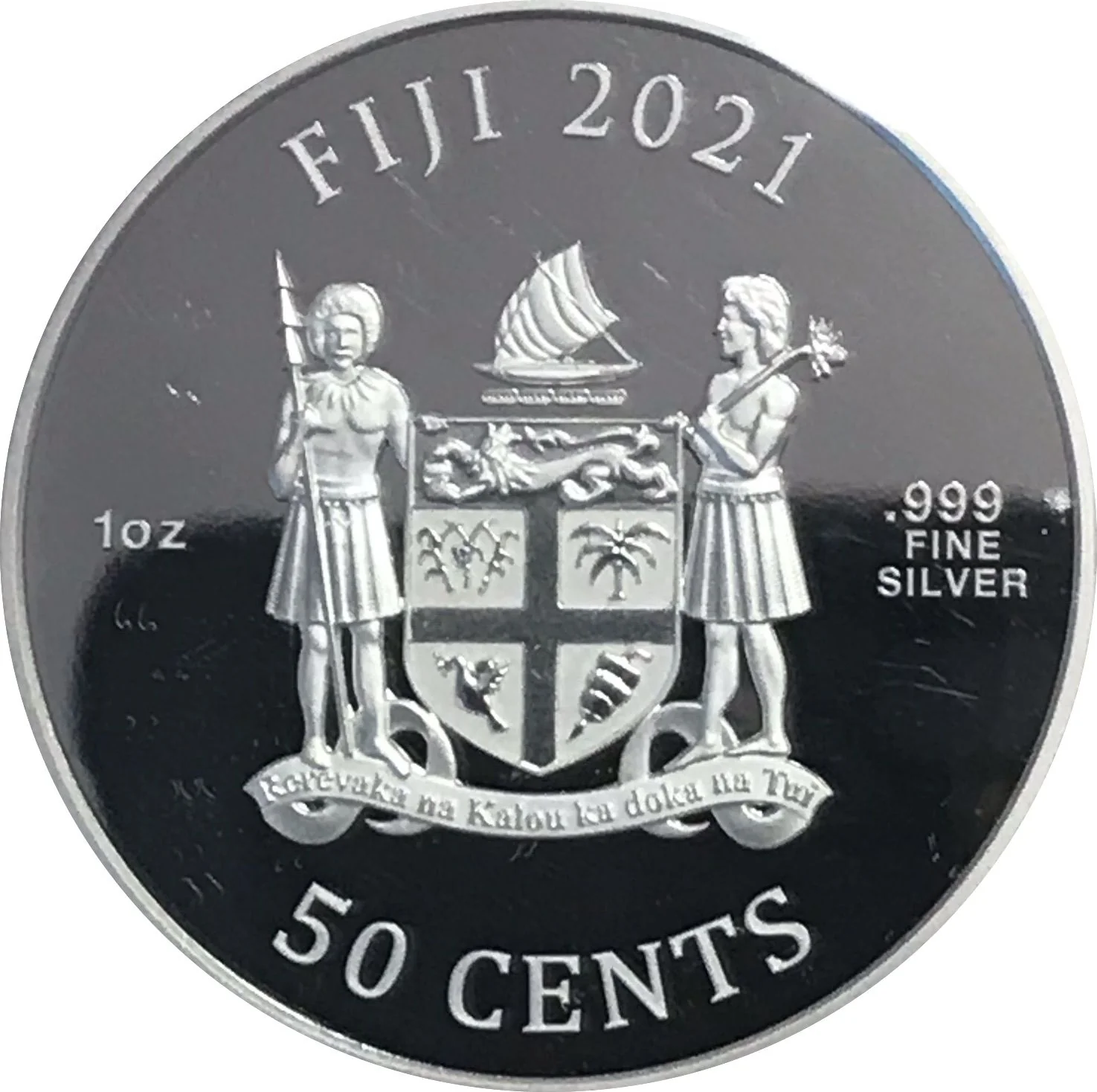 The Fijian coat of arms features a heraldic shield with a golden lion holding a cocoa pod, sugarcane, a coconut palm, a dove, and bananas, topped by a Fijian canoe and supported by two Fijian warriors.