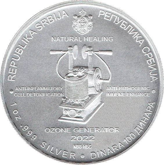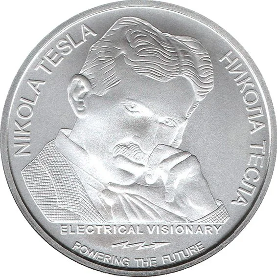 Description: Centered above is Serbia's coat of arms, with a detailed image of Nikola Tesla's Ozone Generator below.
