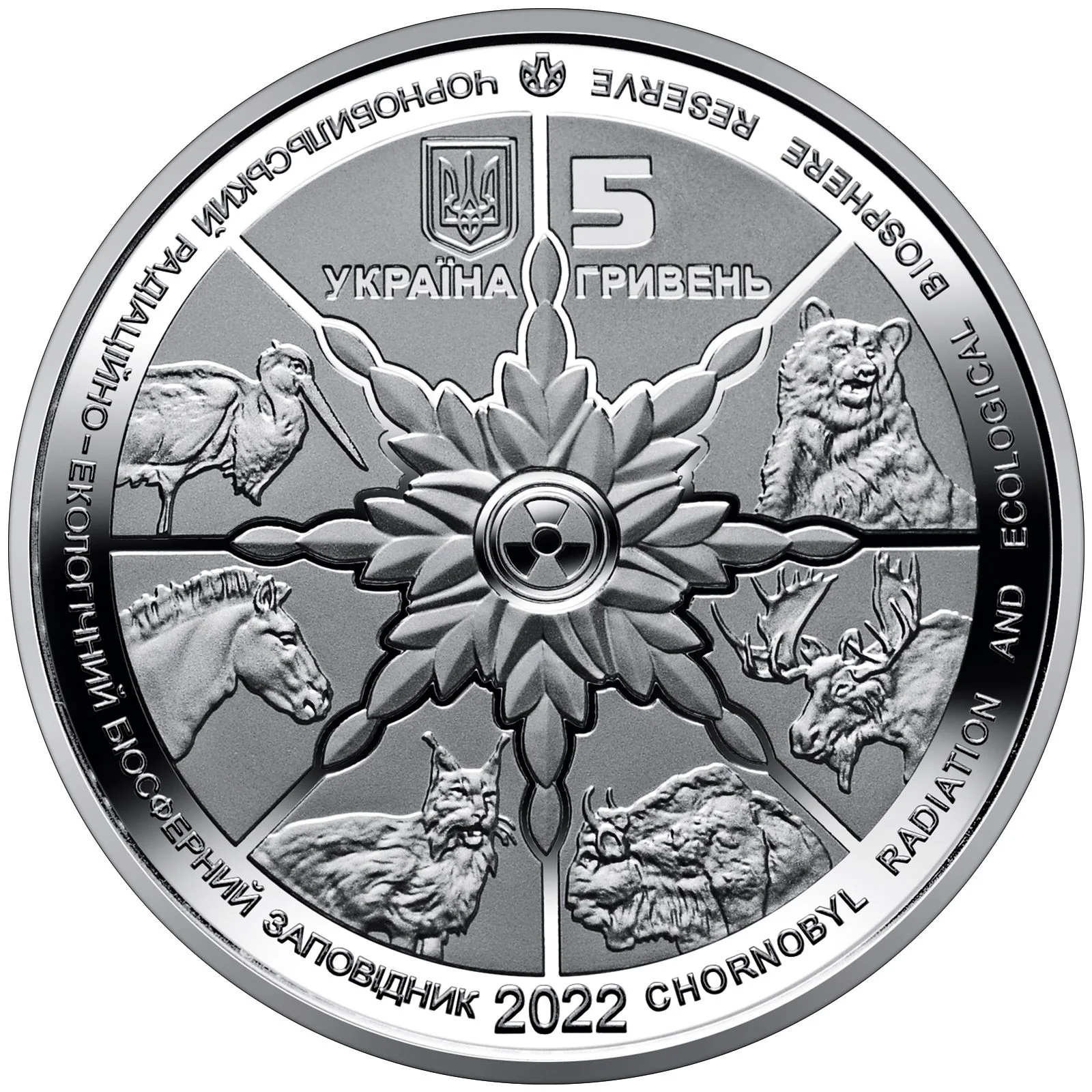 The obverse features Ukraine's small State Coat of Arms, the inscriptions "УКРАЇНА" and "5 ГРИВЕНЬ," and a central "wheel of life" symbol. This combines a stylized radiation sign with leaves and animals like the black stork, Przewalski's horse, and lynx, representing species reborn in the Chornobyl Exclusion Zone. Surrounding inscriptions name the Chornobyl Radiation and Ecological Biosphere Reserve in Ukrainian and English. The 2022 issue year and the mint mark of the NBU Banknote Printing and Minting Works are also present.