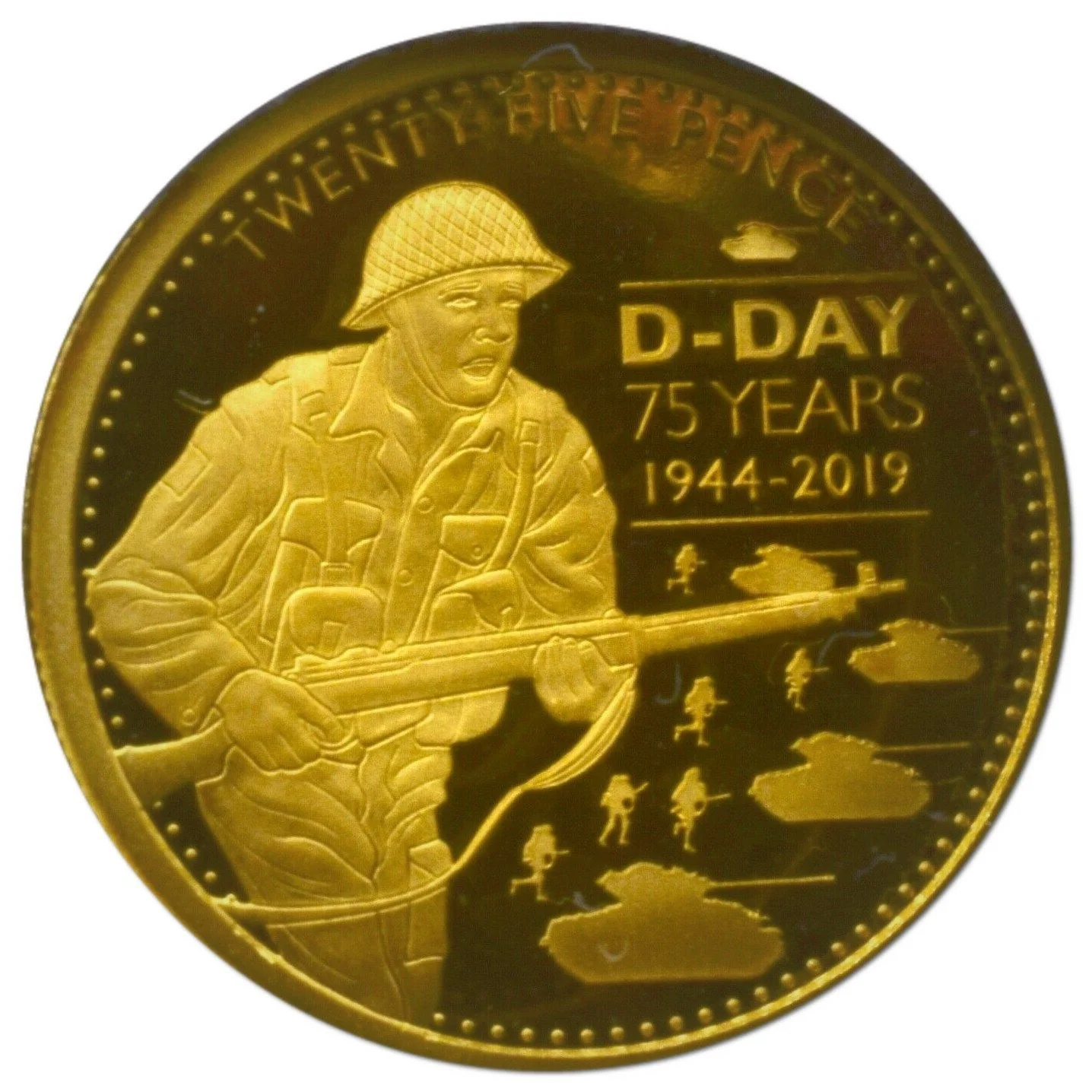 Soldier with guns, small soldiers and tanks in background, denomination above
