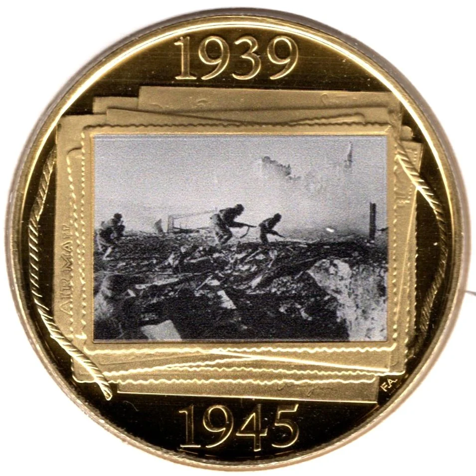 A printed photograph of soldiers in the ruined Battle of Stalingrad, layered over stacked letters and postcards marked "1939" and "1945."
