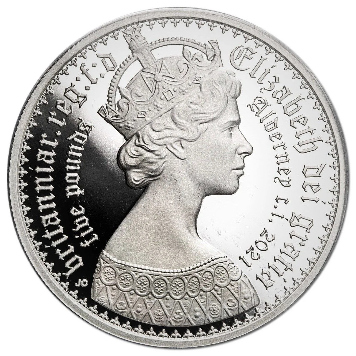 Description: Queen Elizabeth II portrait right, gothic style, inscription around, left denomination, right date.