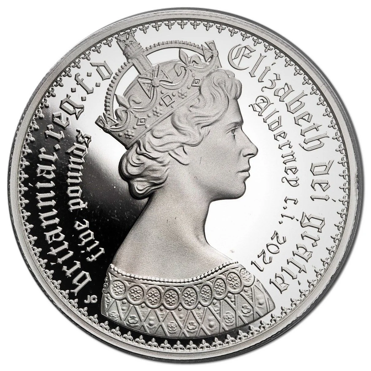 Description: Queen Elizabeth II portrait right, gothic style, inscription around, left denomination, right date.