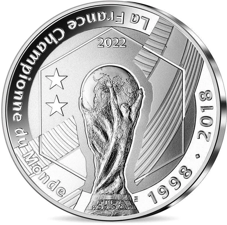 World Cup encircled by inscriptions and dates of France's victories.