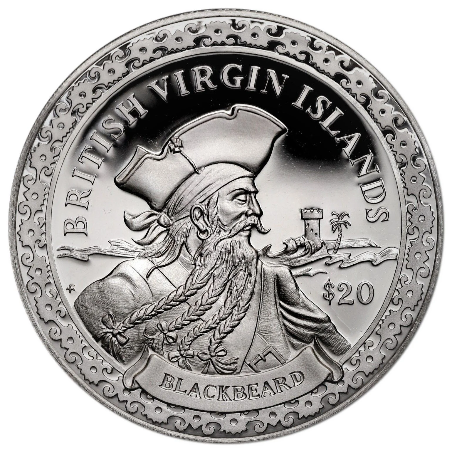 Blackbeard bust with island tower, palm, and patterned border.