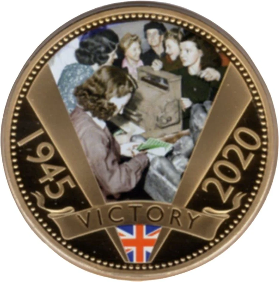 Full-color image of women in a shop, with "1945" on the left, "2020" on the right, "Victory" inscribed below, and a British flag beneath.
