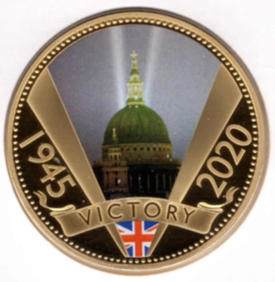 Full-color image of St. Paul's Cathedral, spotlit with a 'V'. "1945" and "2020" flank the scene, with "Victory" and a British flag below.