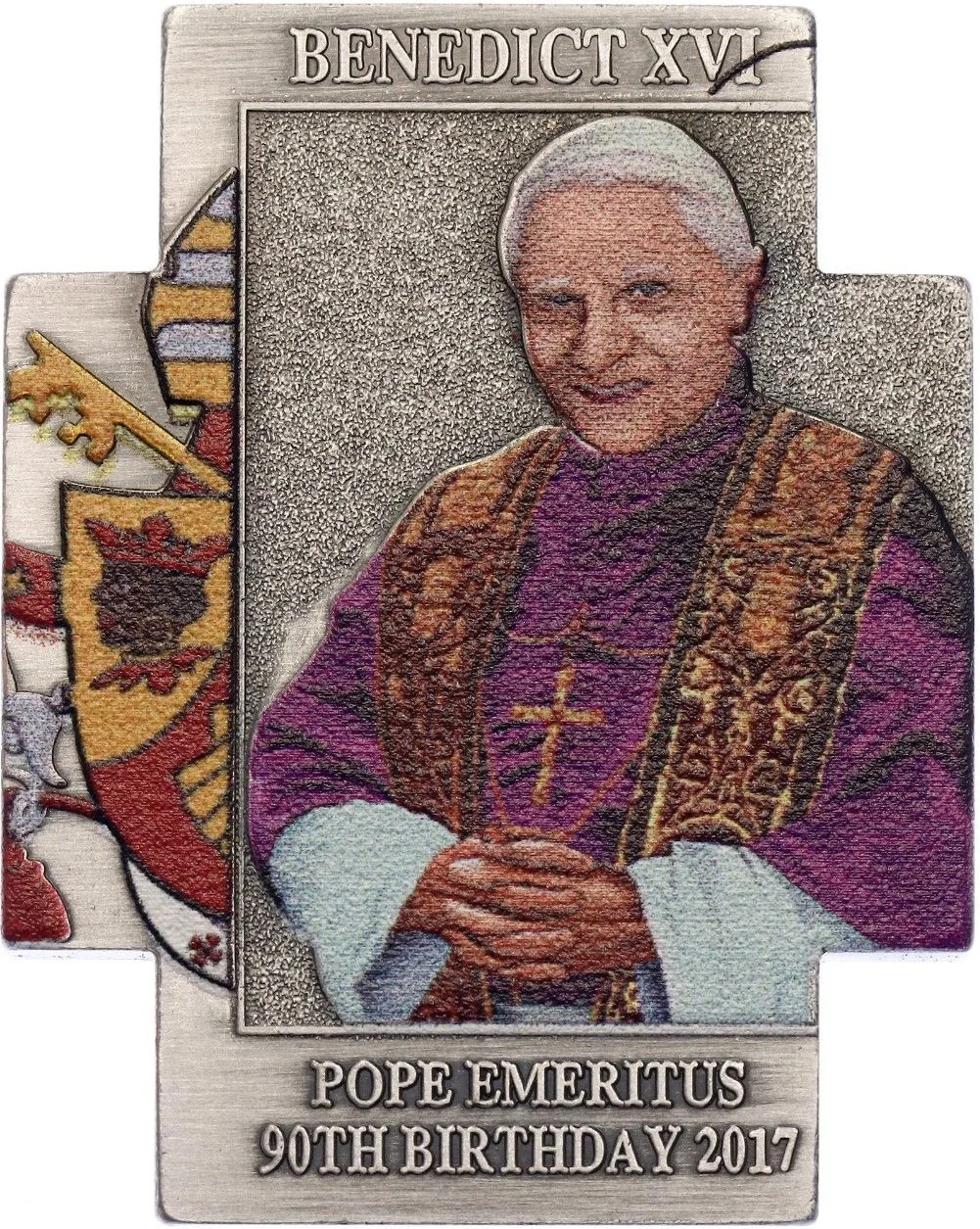 Description: A shield flanked by stallions, topped by a banner and flanked by two spears.