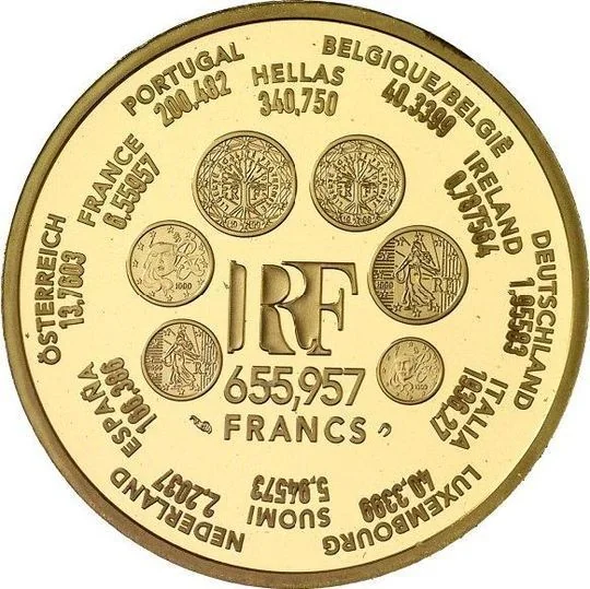 Inscription: BELGIQUE/BELGIË 40,3399 IRELAND 0.787564 DEUTSCHLAND 1,95583 ITALIA 1936,27 LUXEMBOURG 40,3399 SUOMI 5,64573 NEDERLAND 2,20371 ESPAÑA 166,386 ÖSTERREICH 13,7603 FRANCE 6,55957 PORTUGAL 200,482 HELLAS 340,750