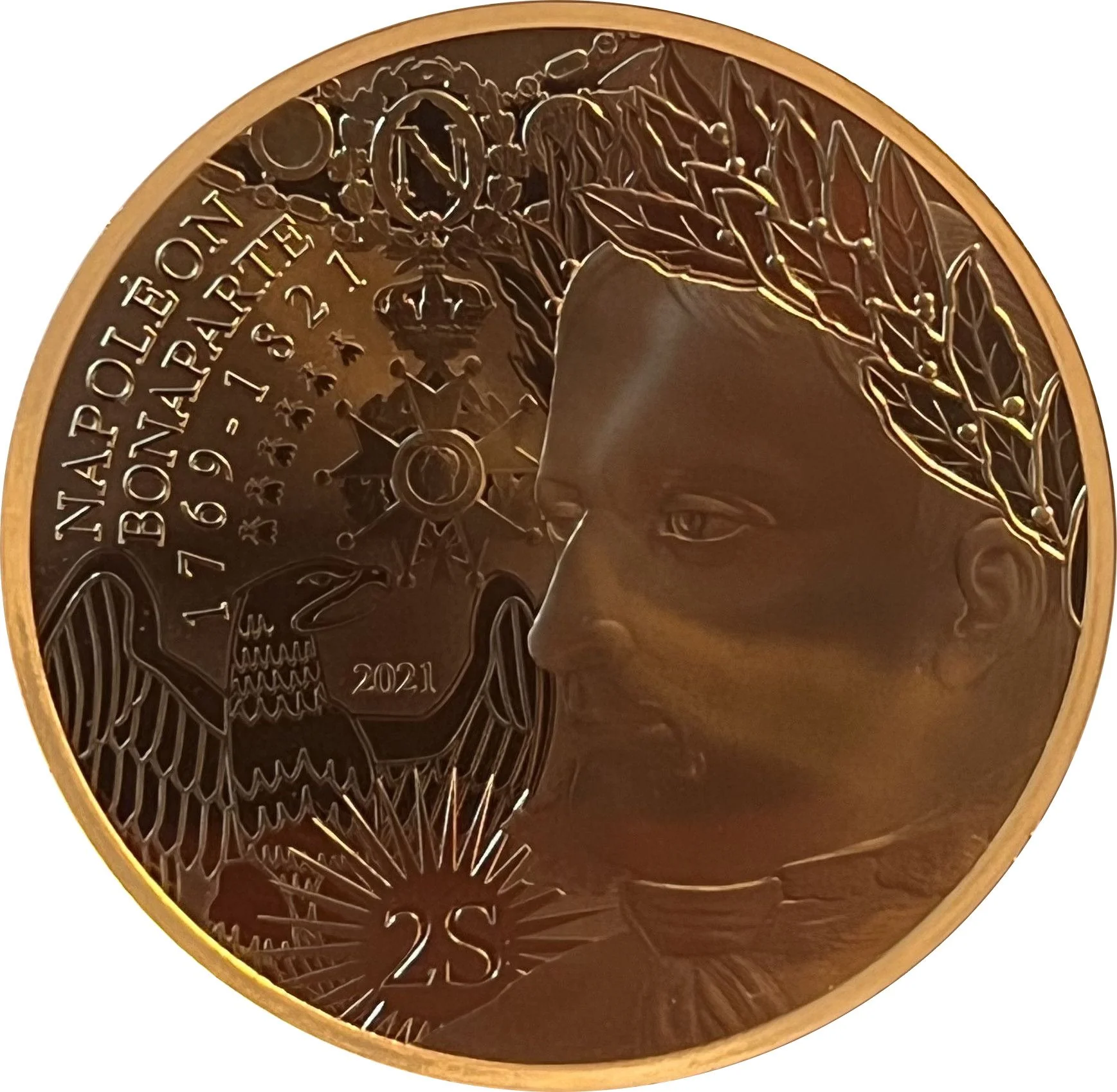 This side features Napoleon's portrait with a laurel wreath, symbols of the Legion of Honor, an eagle, bees, and the Austerlitz sun. "2S" is inscribed, marking the victory date of December 2, 1805.