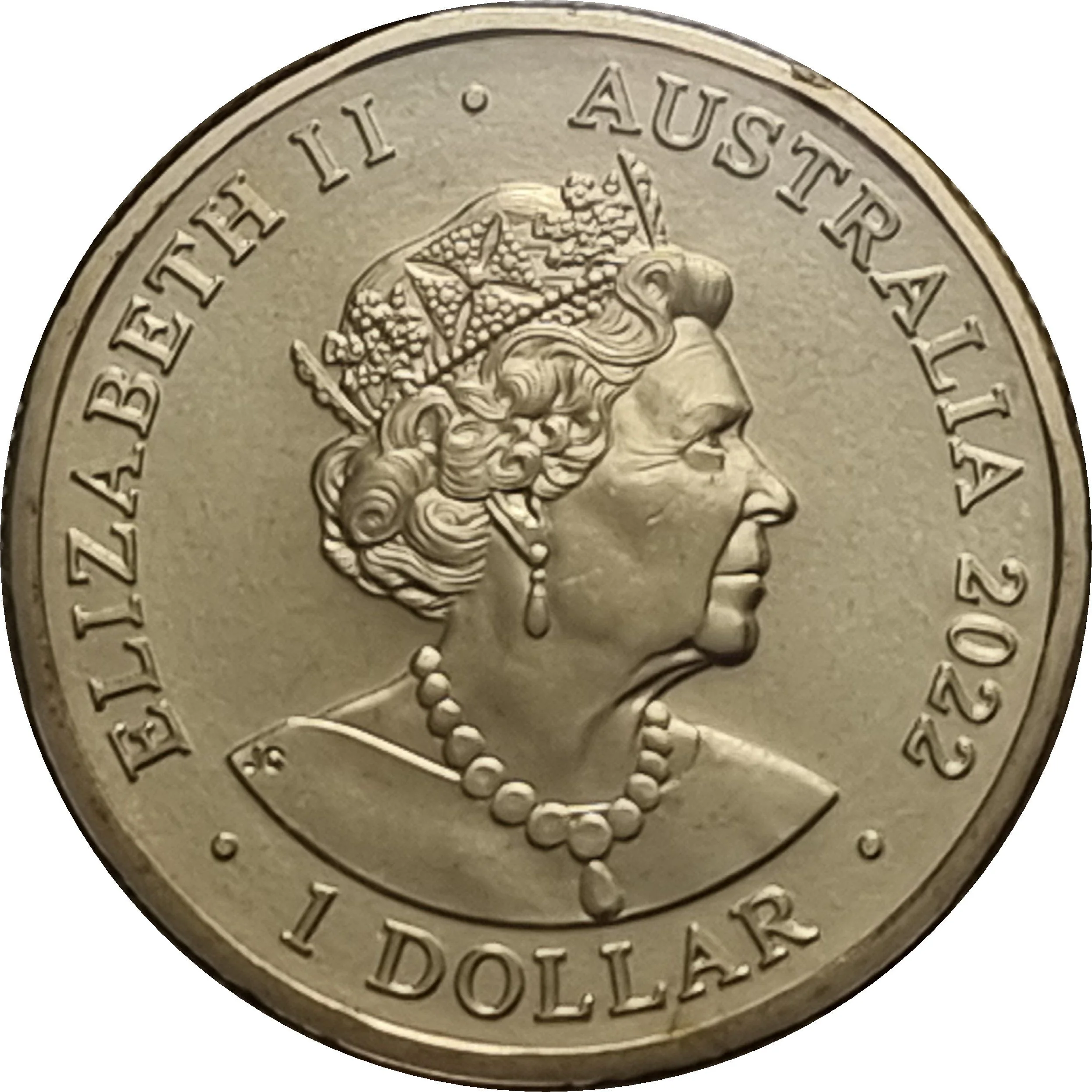 Queen Elizabeth VI in profile, wearing the George IV State Diadem and Victorian Coronation Necklace.