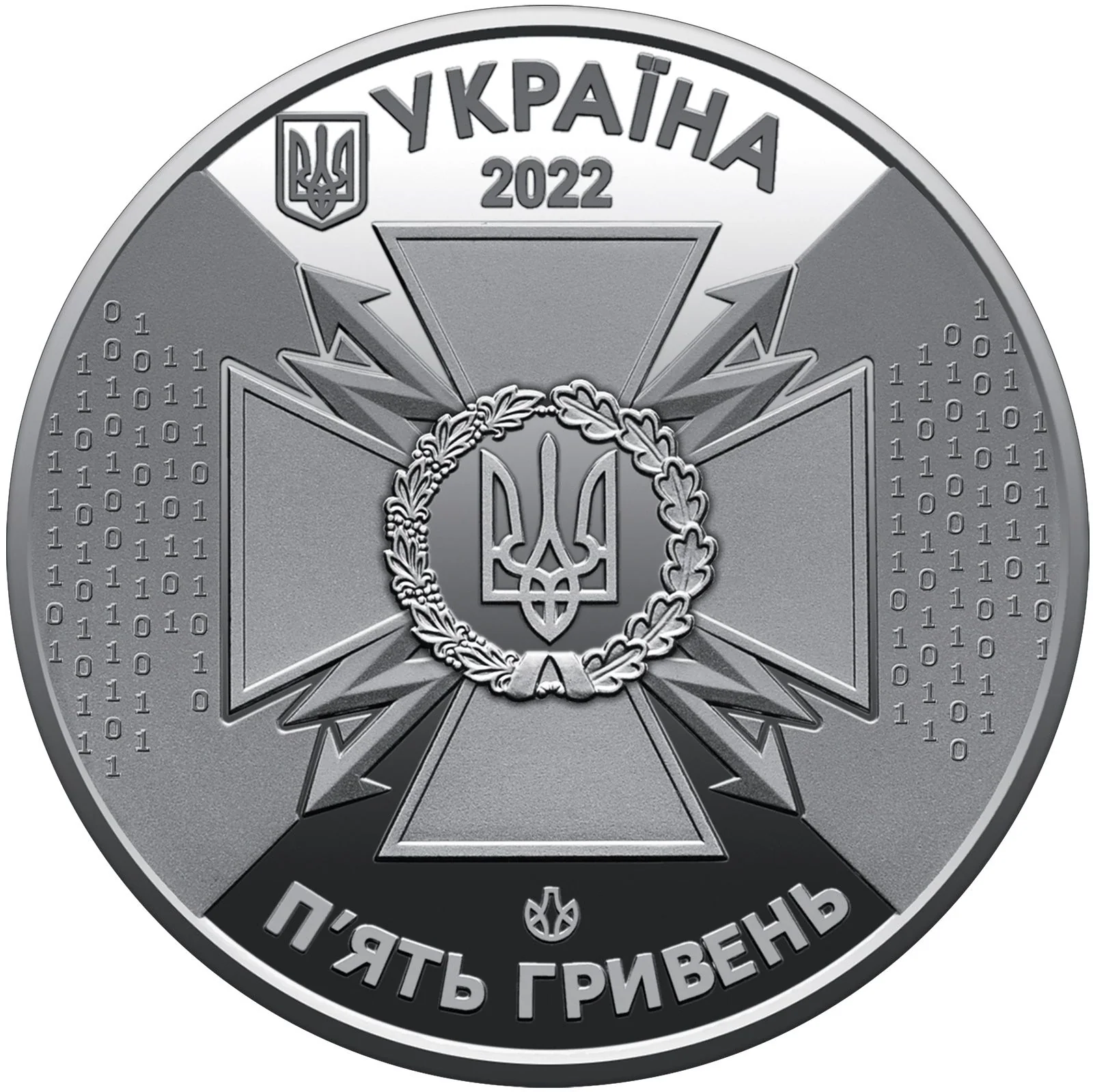 Featuring Ukraine's small State Coat of Arms and "УКРАЇНА/2022," the design centers on the emblem of the State Service for Special Communications against a binary code background. Below, mirrored, are the logo of the Banknote and Mint and the denomination "П’ЯТЬ ГРИВЕНЬ."