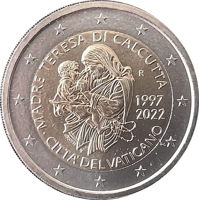 The design portrays Mother Teresa with a child. "MADRE TERESA DI CALCUTTA" arches above, with "CITTÀ DEL VATICANO" below. The mintmark 'R' and years '1997' and '2022' are to the right. The outer ring features the 12 stars of the European flag.