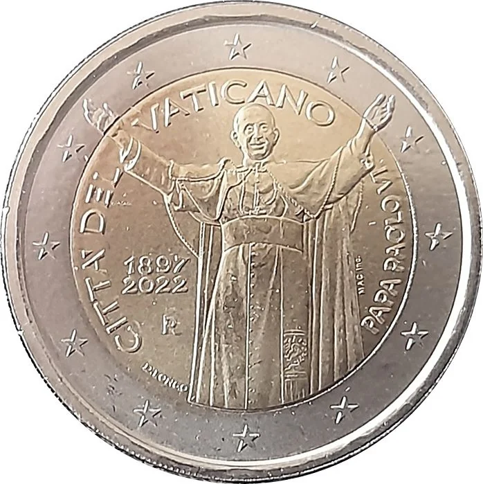 The coin shows the Pope smiling, arms outstretched in his characteristic greeting. He wears a cassock with a fascia bearing his pontifical coat of arms, along with his cape and cloak.