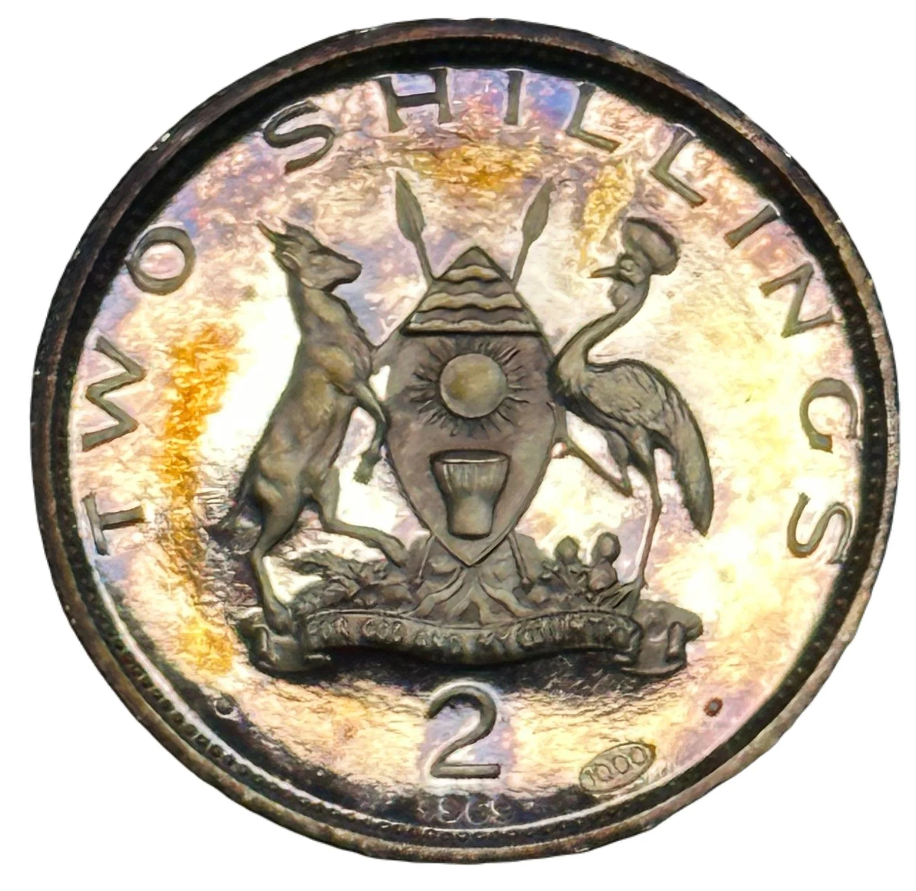 Ugandan coat of arms detail. Dotted rim circle. Issue date below.
