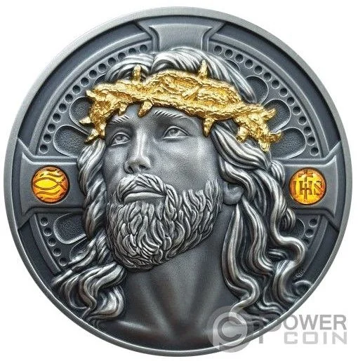 Front-facing Jesus with crown of thorns, halo, cross in background, and amber side inserts.