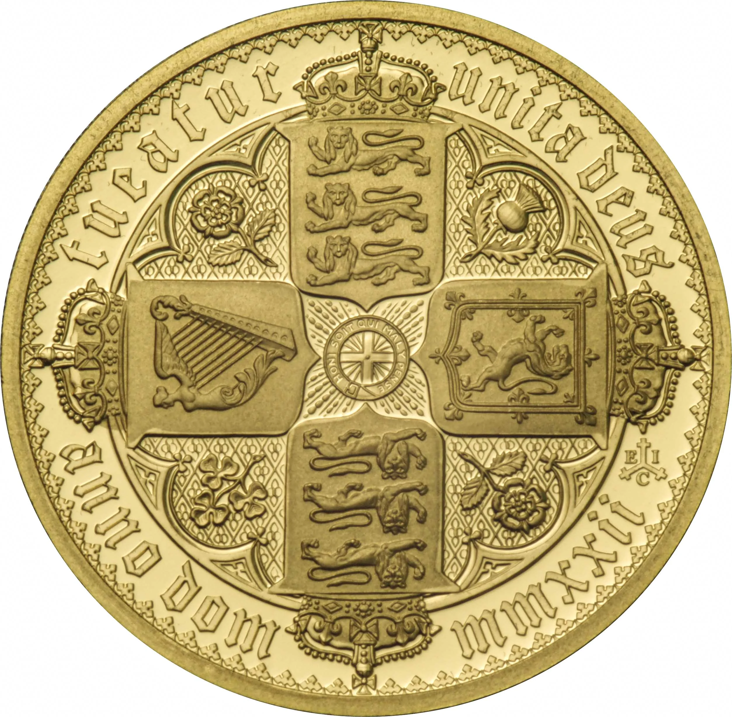 A cruciform of four shields centered on the arms and motto of the Order of the Garter.