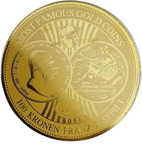 Description: Franz Joseph I 100 corona gold coin. Shield above, beaded rim.
