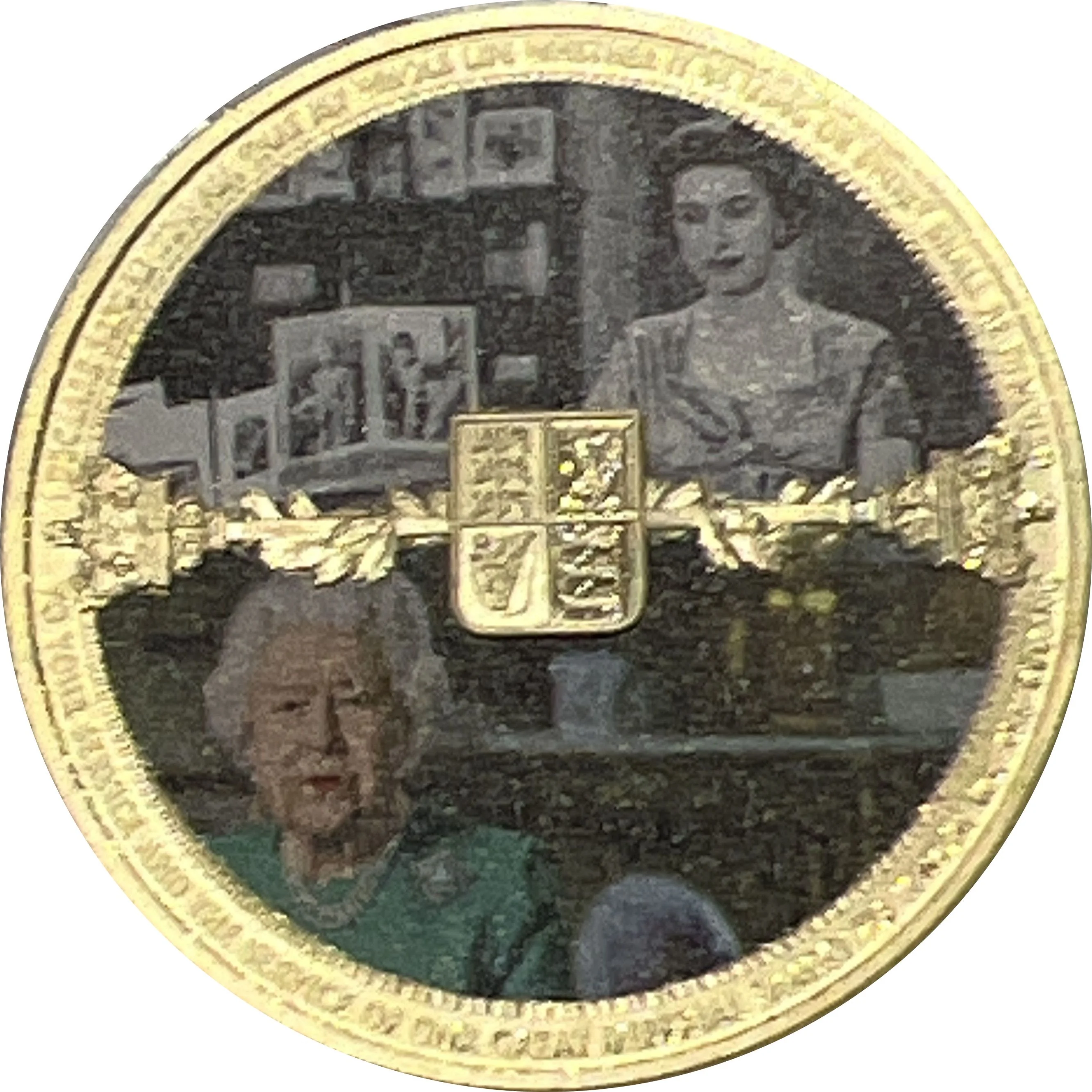 The coin features two historic broadcasts: Queen Elizabeth II's first televised Christmas speech in 1957 and her 2020 coronavirus address, where she invoked "We will meet again." They are divided by a sceptre with oak sprigs, St Edward's crowns, and the Royal Arms shield. The inscription recalls her 1947 pledge to Commonwealth service.