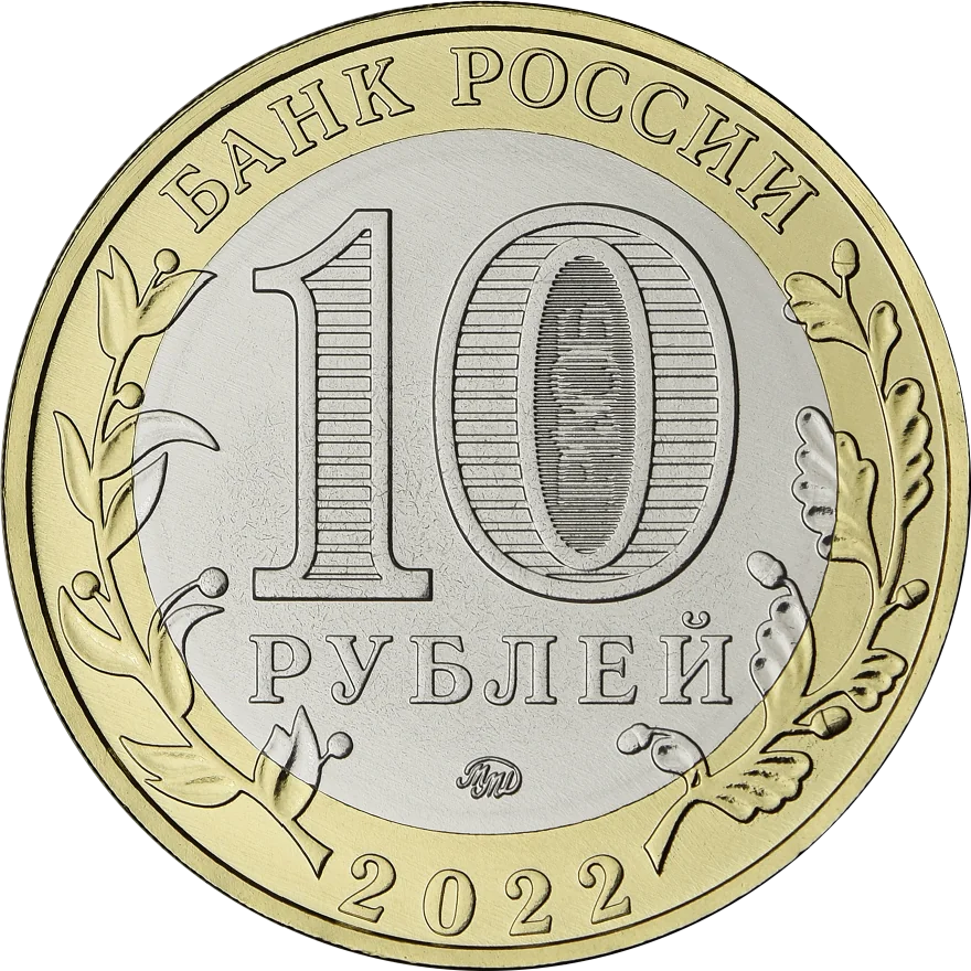 The obverse features "БАНК РОССИИ" at the top and "2022" at the bottom on the outer ring, flanked by laurel and oak branches extending onto the disc. The central face value "10 РУБЛЕЙ" has a security element inside the '0' showing "10 РУБ" at different angles. The Moscow Mint trademark is at the disc's bottom.
