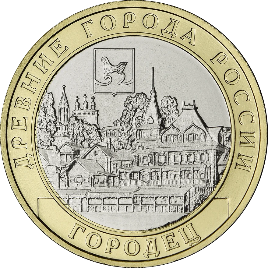 The reverse features a relief of Gorodets' panorama, the district emblem at upper left, and the inscriptions "ДРЕВНИЕ ГОРОДА РОССИИ" above and "ГОРОДЕЦ" below on the outer ring.