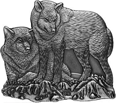 The reverse features a detailed wolf and she-wolf in their habitat, with the mint year "2016" centered below.