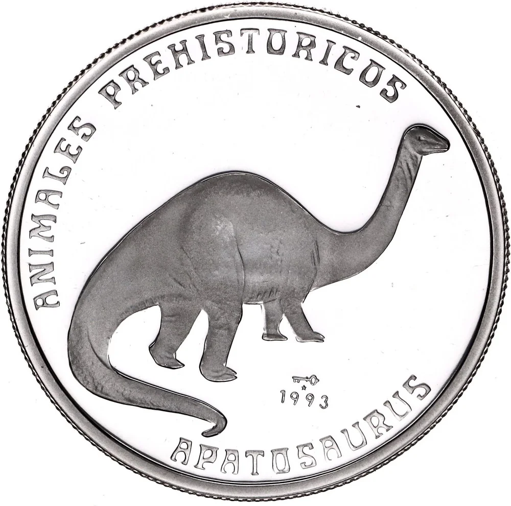 Apatosaurus facing right. Top: event name in curved text. Below: animal name, mintmark, and date.