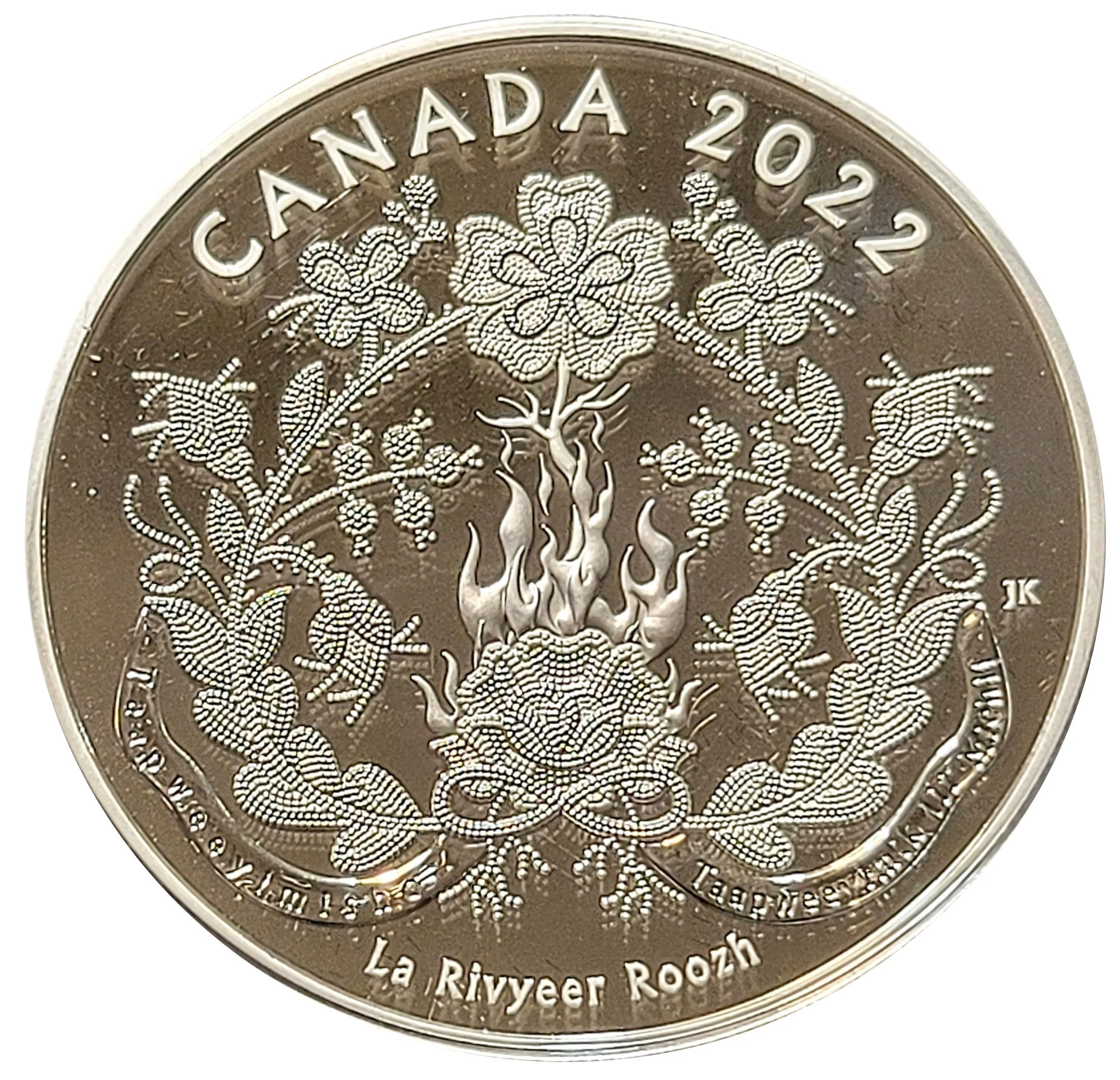 The reverse features an original floral beadwork pattern by Métis artist Jennine Krauchi. Intertwined roots and the Red River ("LA RIVYEER ROOZH" in Michif) symbolize homeland and ancestry, while an infinity symbol represents an unbreakable spirit. The river includes the Michif words "TAAPWEEYIMISHO" and "TAAPWEEYIMIK LII MICHIF" ("Believe in yourself" and "Believe in the Métis"). A central prairie rose signifies survival and cultural resurgence after a period of loss, with stems, "mouse tracks," leaves, and buds expressing love and joy.