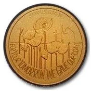 Poppies with soldier and grave behind, denomination above.