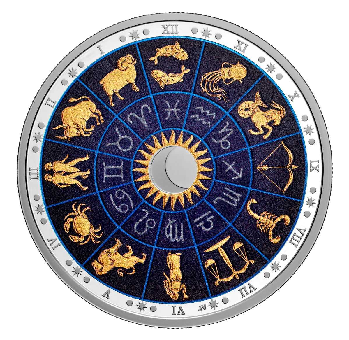 The celestial circle is divided into 12 counter‑clockwise sections, each marked by a Roman numeral and zodiac glyph. These glyphs form an inner ring around the central sun‑moon motif. Under black light, the 12 constellations appear in this inner ring.