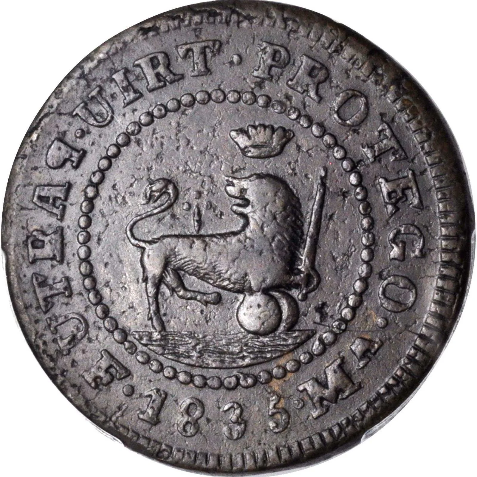 Crowned lion with sword and globes above waves, within beaded circle.