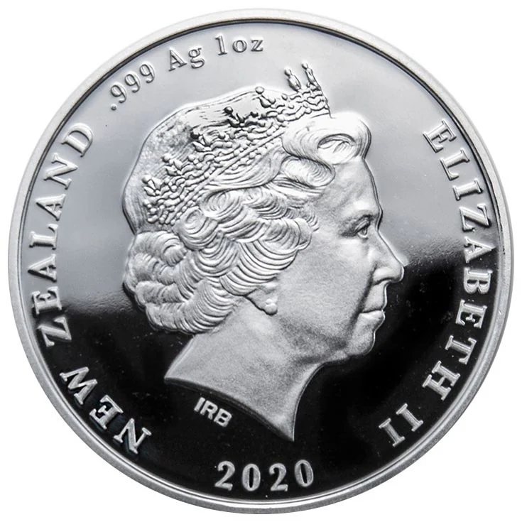 This coin depicts Hinauri mourning her husband Irawaru, who has been transformed into a dog, adorned with koru designs.