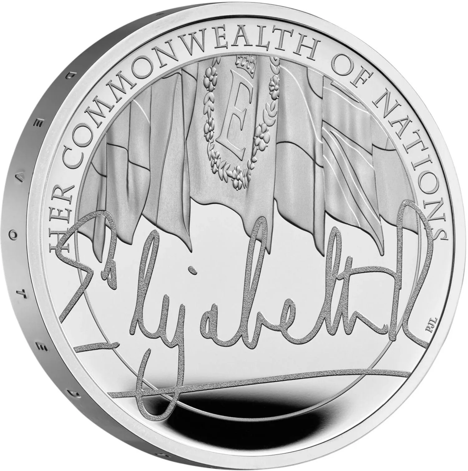 Queen Elizabeth II's signature overlaid on a flag background.