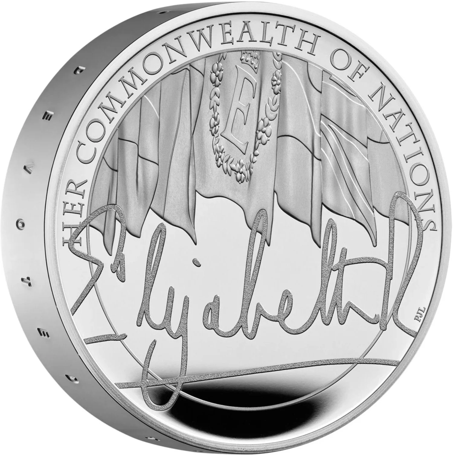 Queen Elizabeth II's signature overlaid on a flag background.
