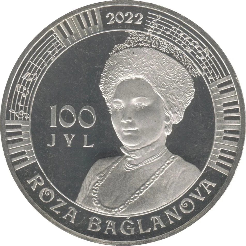 Portrait of Roza Baglanova with a left-side inscription. The border includes her name, the date, musical notes, and piano keys.