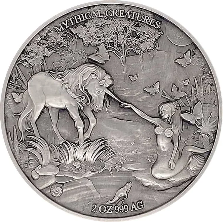 Mermaid touching a unicorn's horn by a forest with butterflies.