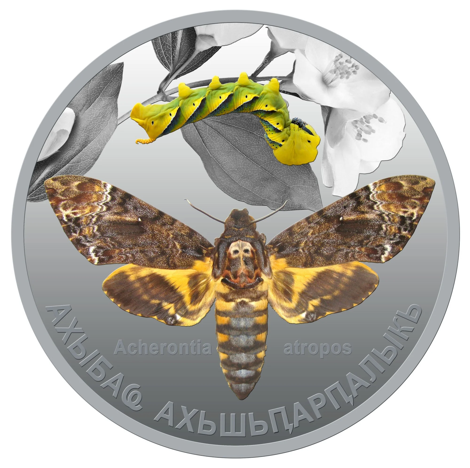Republic of Abkhazia arms and value atop a large stylized butterfly at upper left. Year and issuer below. Additional stylized butterflies to the right.