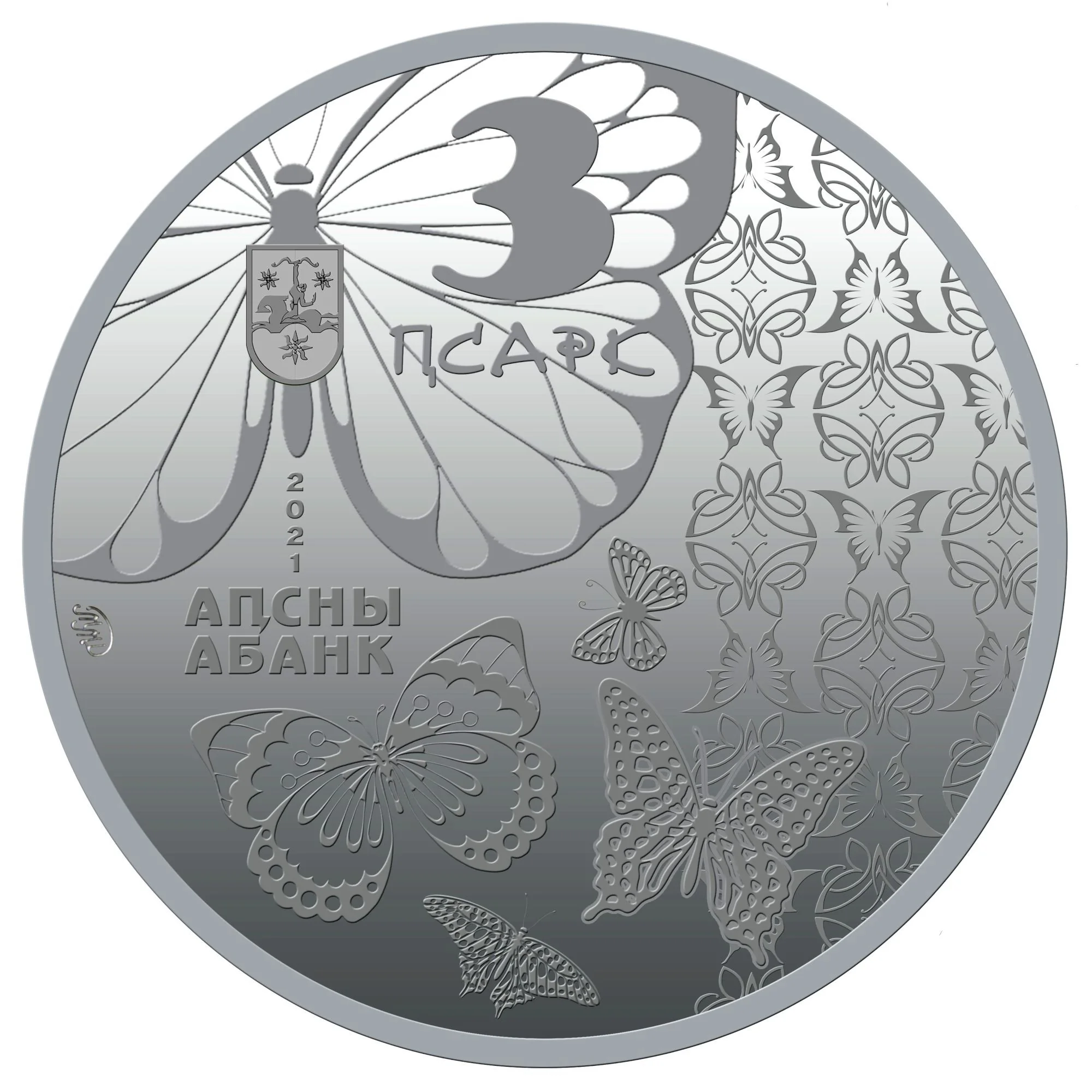 Abkhazia's arms and value over a large stylized butterfly at top left. Year and issuer below. Additional stylized butterflies to the right.